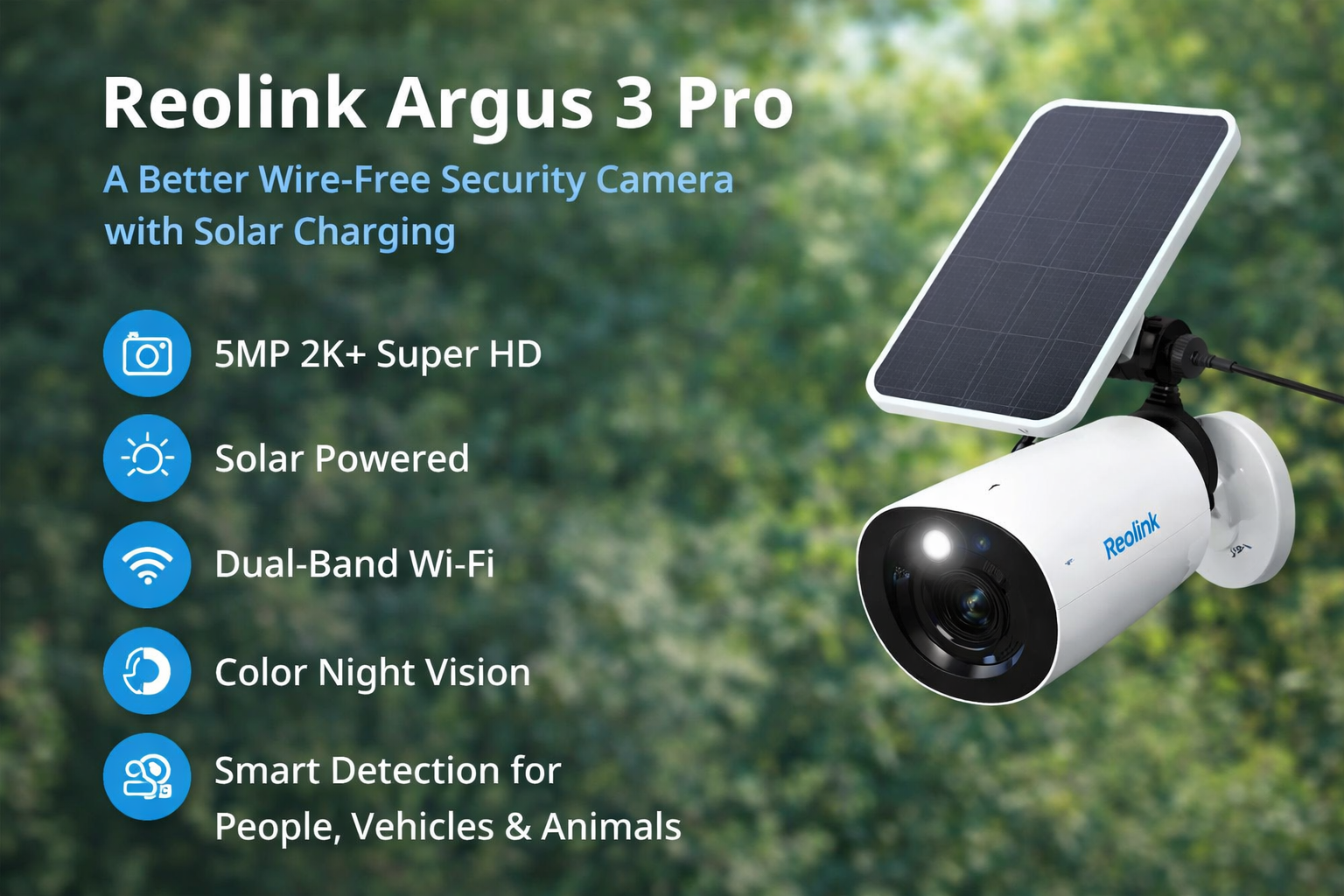 The biggest reason to look at the Argus 3 Pro is that it covers the features many buyers actually need for day-to-day outdoor security without becoming overly complicated. Reolink positions it as a standalone battery camera with solar support, 5MP 2K+ detail, color night vision, and smart detection for people, vehicles, and animals. That combination puts it in a strong middle ground for practical outdoor monitoring.